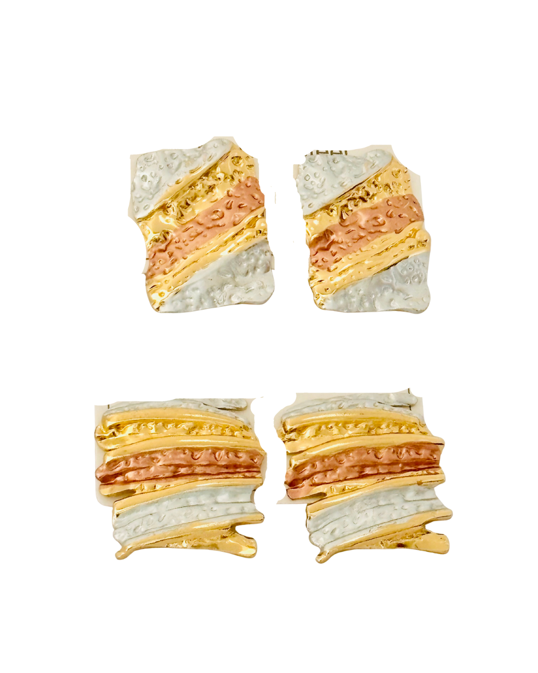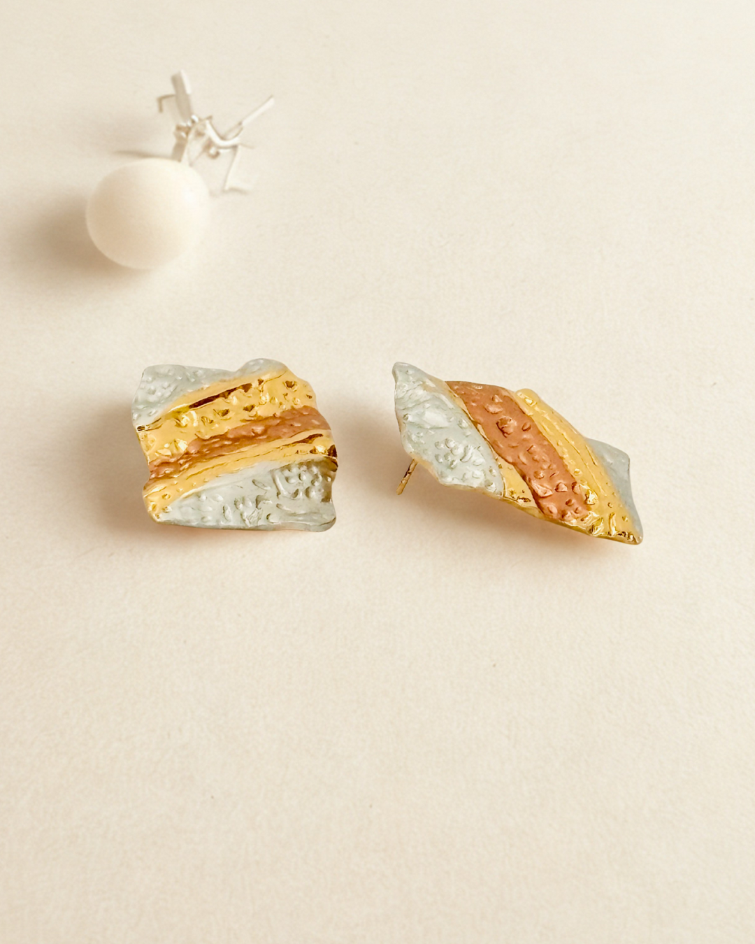 Bold and artistic, these dual-tone abstract stud earrings feature a unique textured design with a blend of gold and silver tones. Perfect for those who love statement jewellery, they add a modern and edgy twist to any outfit.