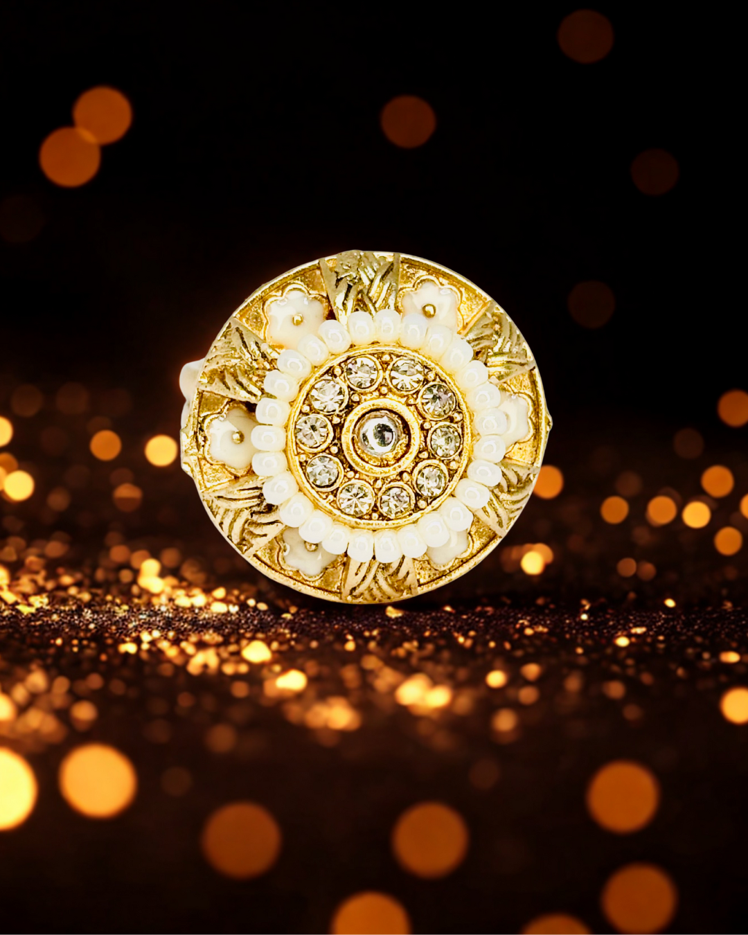 Gracefully handcrafted, this antique gold dome ring features intricate floral carvings, a ruby-red centerpiece, shimmering white stones, and a delicate pearl border. A regal accessory that brings vintage elegance to your festive and ethnic looks.