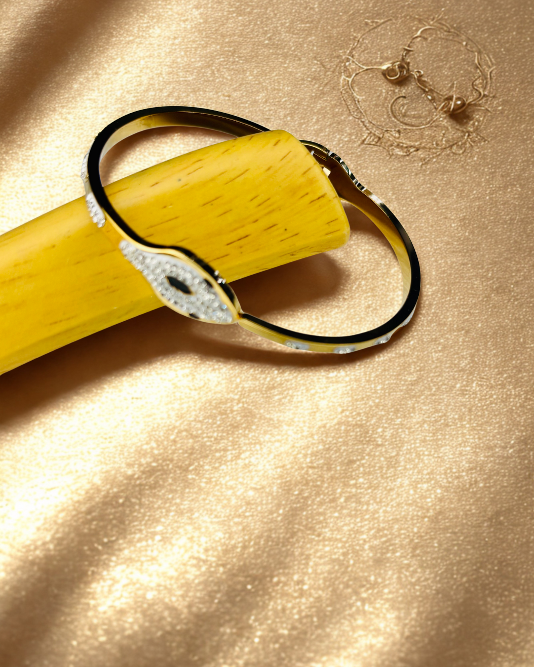 Shield your aura in style with the Evil Eye Sparkle Bangle—a sleek gold-plated bracelet featuring a shimmering evil eye centerpiece encrusted with dazzling stones. A modern charm for protection, power, and elegance.