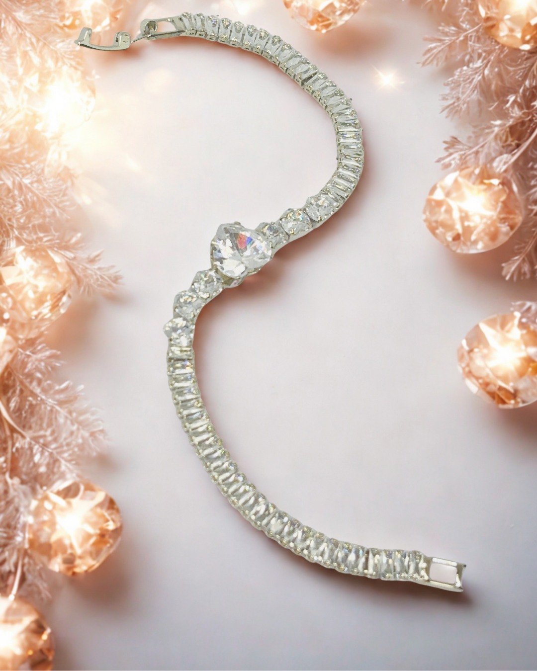 Elegant silver-plated tennis bracelet featuring a sparkling heart-shaped solitaire centerpiece, surrounded by brilliant-cut cubic zirconia stones for timeless glamour. Crafted from premium alloy with rhodium plating for a lustrous, tarnish-resistant finish.