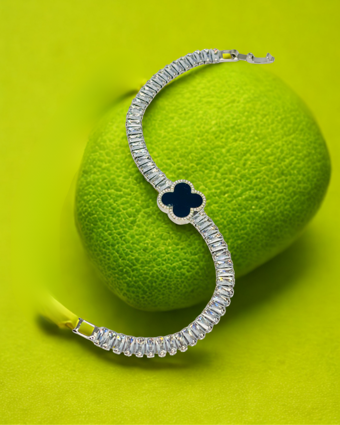 Elevate your elegance with the Midnight Clover Crystal Bracelet, designed with a striking black clover charm and a row of shimmering baguette-cut crystals. Minimal yet luxurious — perfect for evening soirées, formal events, or adding a touch of glamour to your everyday look.
