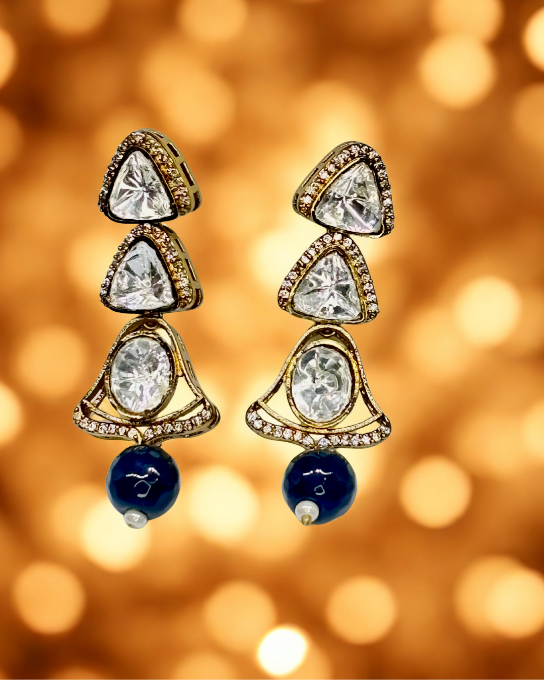 Elevate your ethnic charm with these dazzling Kundan-style drop earrings, featuring a trio of sparkling clear stones set in antique gold frames, topped with shimmering American diamonds and finished with a royal blue enamel bead and pearl drop. Perfect for weddings, festivals, or elegant evenings.